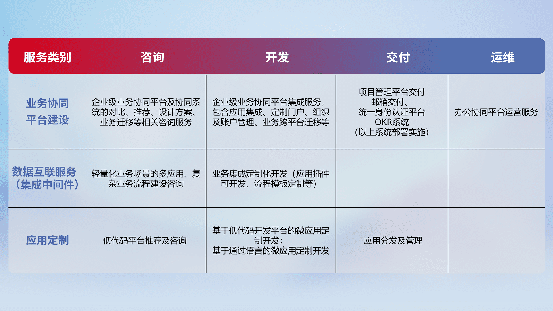 针对钉钉、、企微、、IDaas等平台级产品提供产品的规划、、、方案、、交付、、、、定制化开发等服务,,,,实现如统一协同办公、、、、智能客户服务、、、混合会议管理、、、智能数据查询、、等业务场景,,,实现数字化转型。。