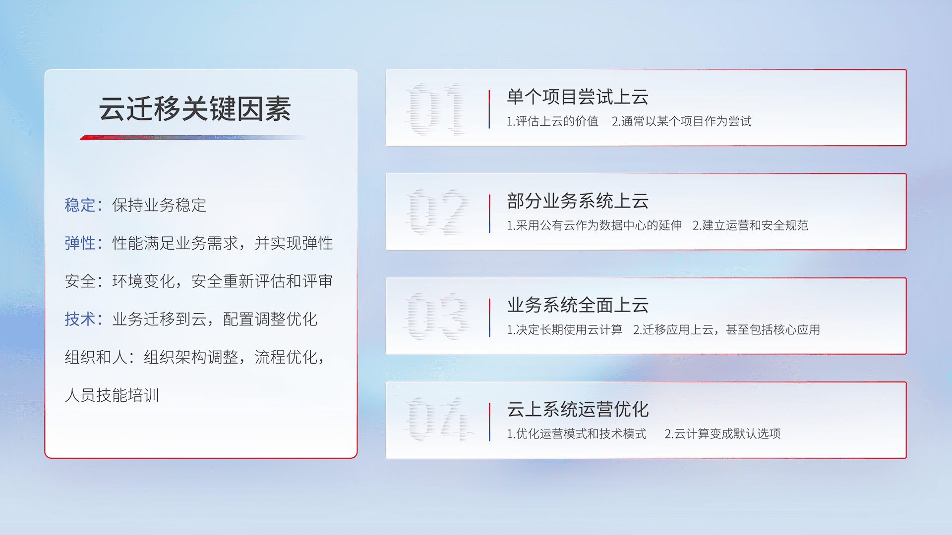 结合实际业务,,,从规划设计、、、、云平台选型、、云原生改造、、、、数据迁移、、集成交付,,,,迁移全过程为客户识别最佳上云路径,,做好风险识别管理,,设计网络架构、、、身份权限、、、、安全审计合规、、、、操作审计、、、、日志审计、、监控告警策略、、、、多站点容灾设计等,,,,对云上基础设施进行整体规划,,,,提升IT治理水平,,以满足弹性、、、高可用、、、高性能的需求。。。
