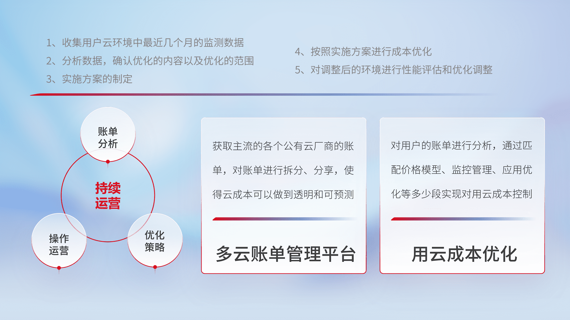 通过多云纳管,,,以统一的资源数据模型把客户的云资源进行抽象和封装,,进而实现对多云资源的统一操作,,保障云资源管理的可靠性、、、稳定性与可用性。。。。量身定制化运维内容,,,,配置、、、开发运维、、补丁管理、、备份、、监控、、认证和访问管理、、、审计和日常巡检等,,保障在用云过程中的可靠度,,,,稳定度以及高可用率。。。