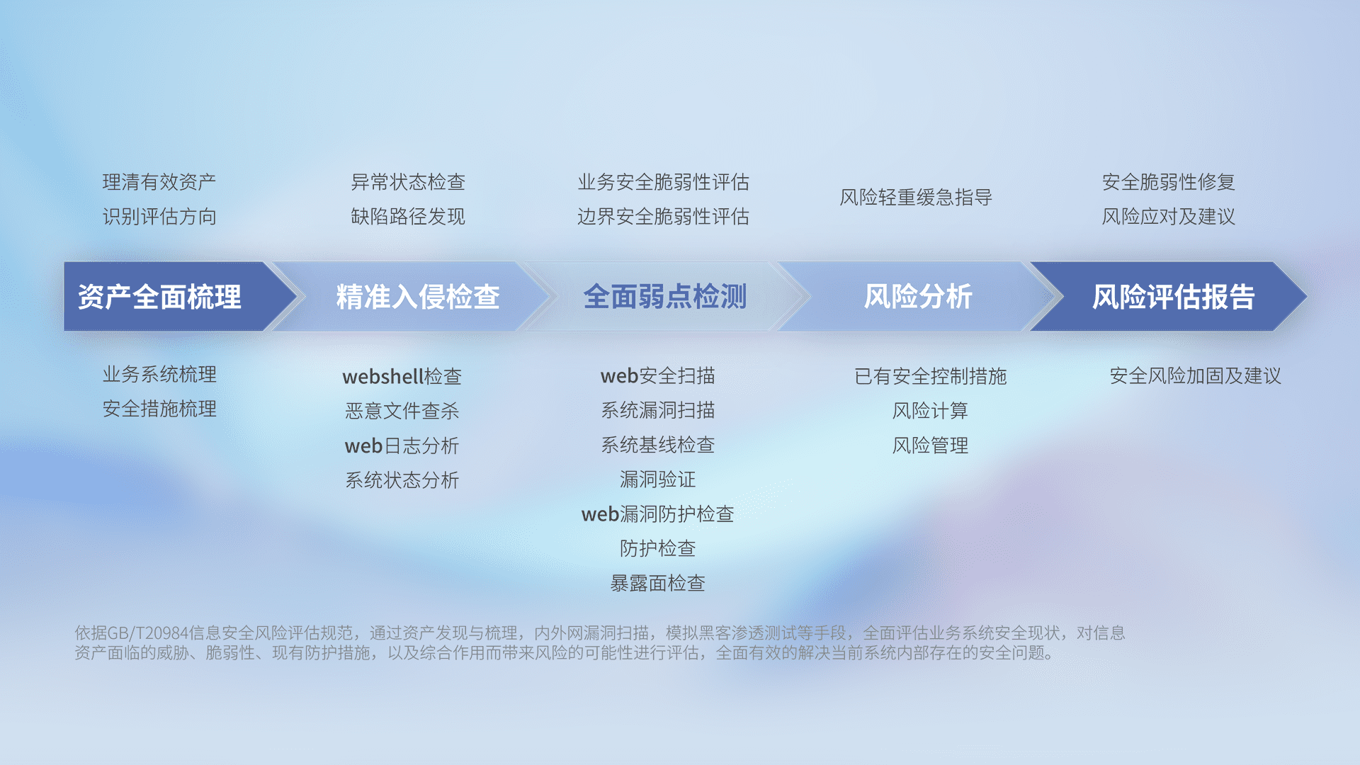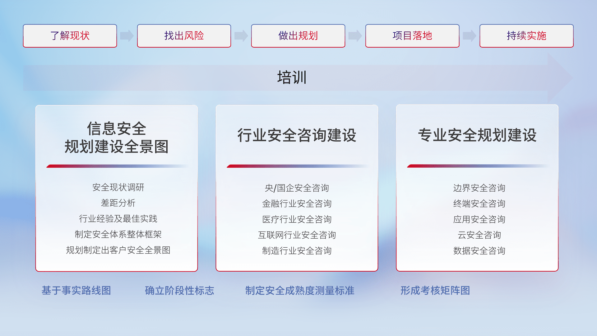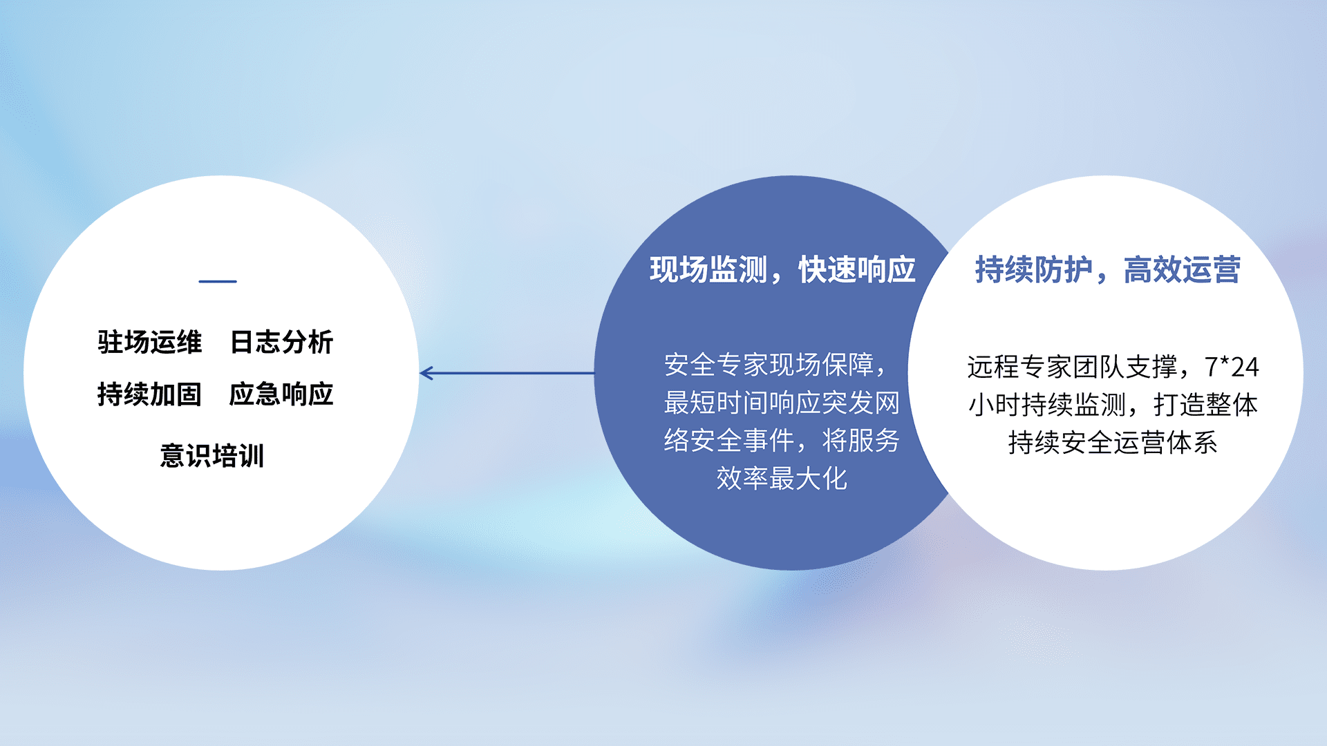 针对客户行业特性,,,以专业的安全服务+多厂商联合解决方案提供专属的一站式安全管理服务,,,帮助客户全面感知网络空间威胁,,基于识别、、、、检测、、、分析、、、防护、、监测、、、、响应的服务理论模型,,,,从方案咨询、、、、集成交付、、、、评估验证、、、、优化加固、、运维运营,,,,致力于为客户提供完整的闭环管理式安全服务。。。。以实战经验为客户打造高抵御风险的安全体系,,帮助客户发现威胁、、、对抗威胁、、、、处置威胁,,,不断积累安全对抗能力,,持续保障数字化安全。。。。
